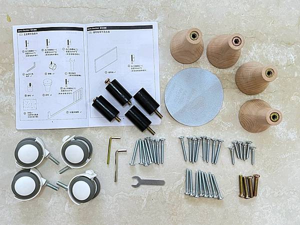 ▲所有配件如圖,床腳有兩種零件選擇,一個是滑輪,一個是床柱