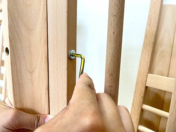 ▲組裝皆以內附的六角板手順時針旋轉,將螺絲栓緊至木頭上的孔洞即可
