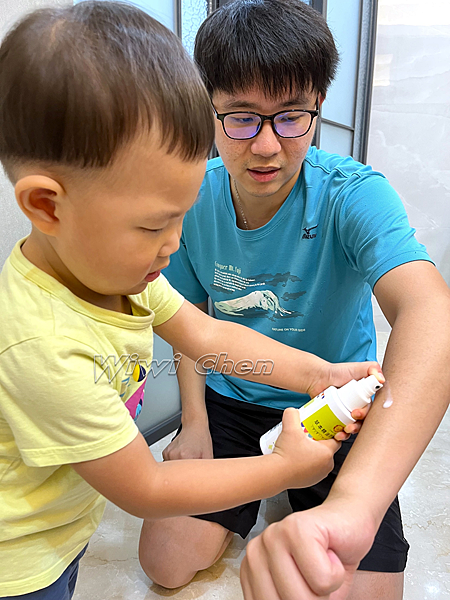 最近錢錢剛上幼稚園,老師說學校裡的蚊子都專找新生的新血吸,出門前先幫他衣服跟褲子噴一些,再放一罐到書包裡讓老師備用,真的不誇張,放學回家檢查,只有臉頰被叮一小包,手腳都沒有!據老師說,其他新生都被叮很慘,錢錢只有一包算很好了XDD