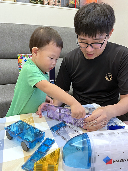 很多人以為,孩子玩磁力積木只是單純的「拼湊形狀」,但其實,這過程可以引導出好多共學的機會。例如,當我們拼太空梭的時候,我會順勢跟孩子聊到「太空梭是怎麼飛上天的?」、「太空人在太空中是怎麼生活的?」這些問題,孩子通常都超有興趣,雖然錢錢還小不會上網找資料,但他會自己去書櫃找太空相關書籍看,針對好奇的問題一一發問,學習動力就像火箭一樣往上衝。而爸媽也不是花瓶擺飾,當孩子有疑問自己卻回答不出來時,我也會連夜爬文找好資料並內化吸收,隔天再告訴錢錢我找到的答案是什麼!雙向的學習也有助親子的凝聚力及互動!